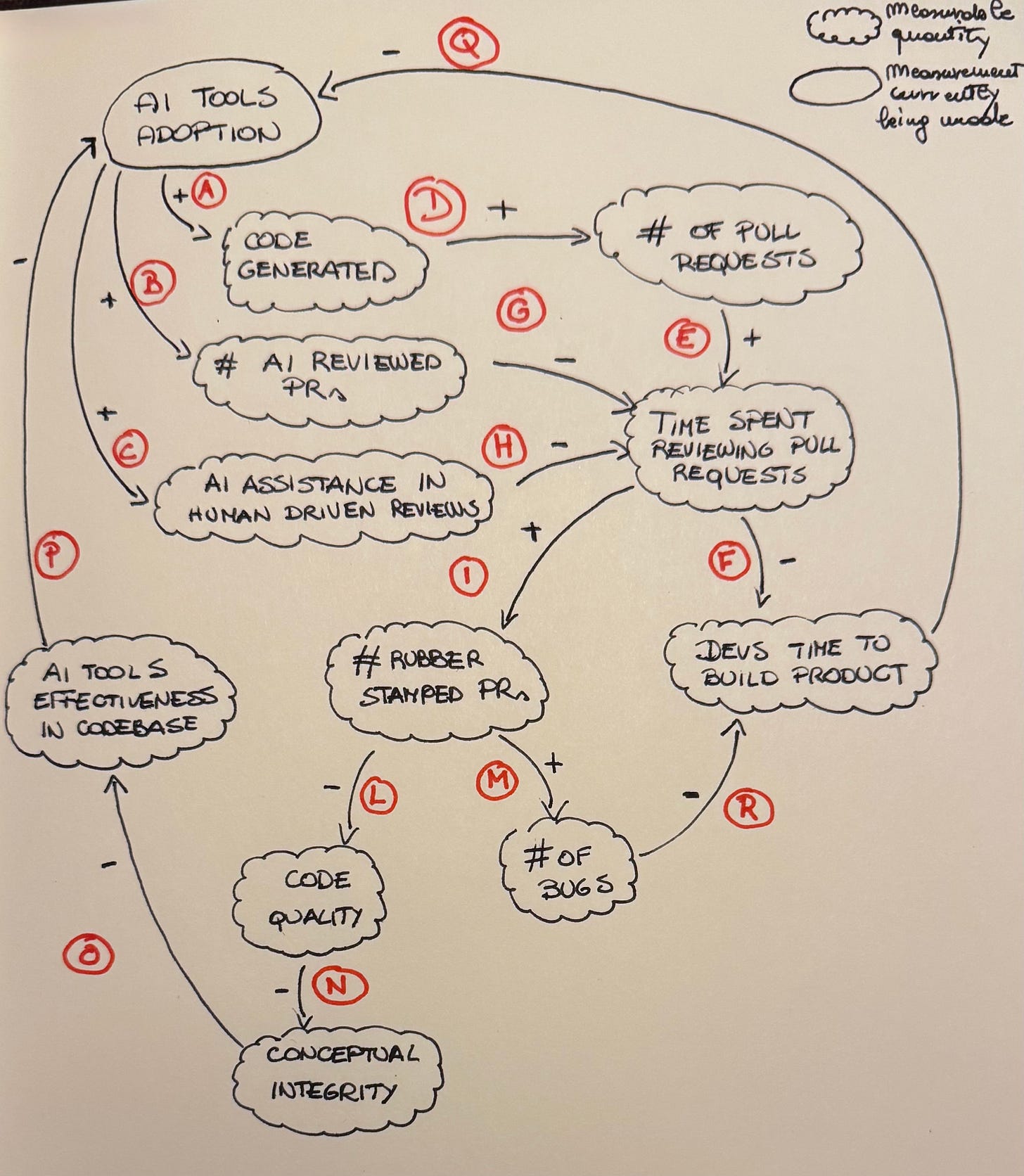 Effects can be positive (more of) or can be negative (less of). In the example below More adoption of AI tools leads to more code being generated. More time spent reviewing pull requests leads to less developers’s time to build the actual product.
